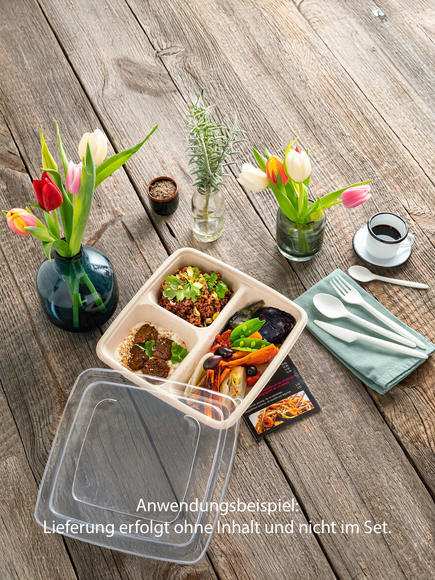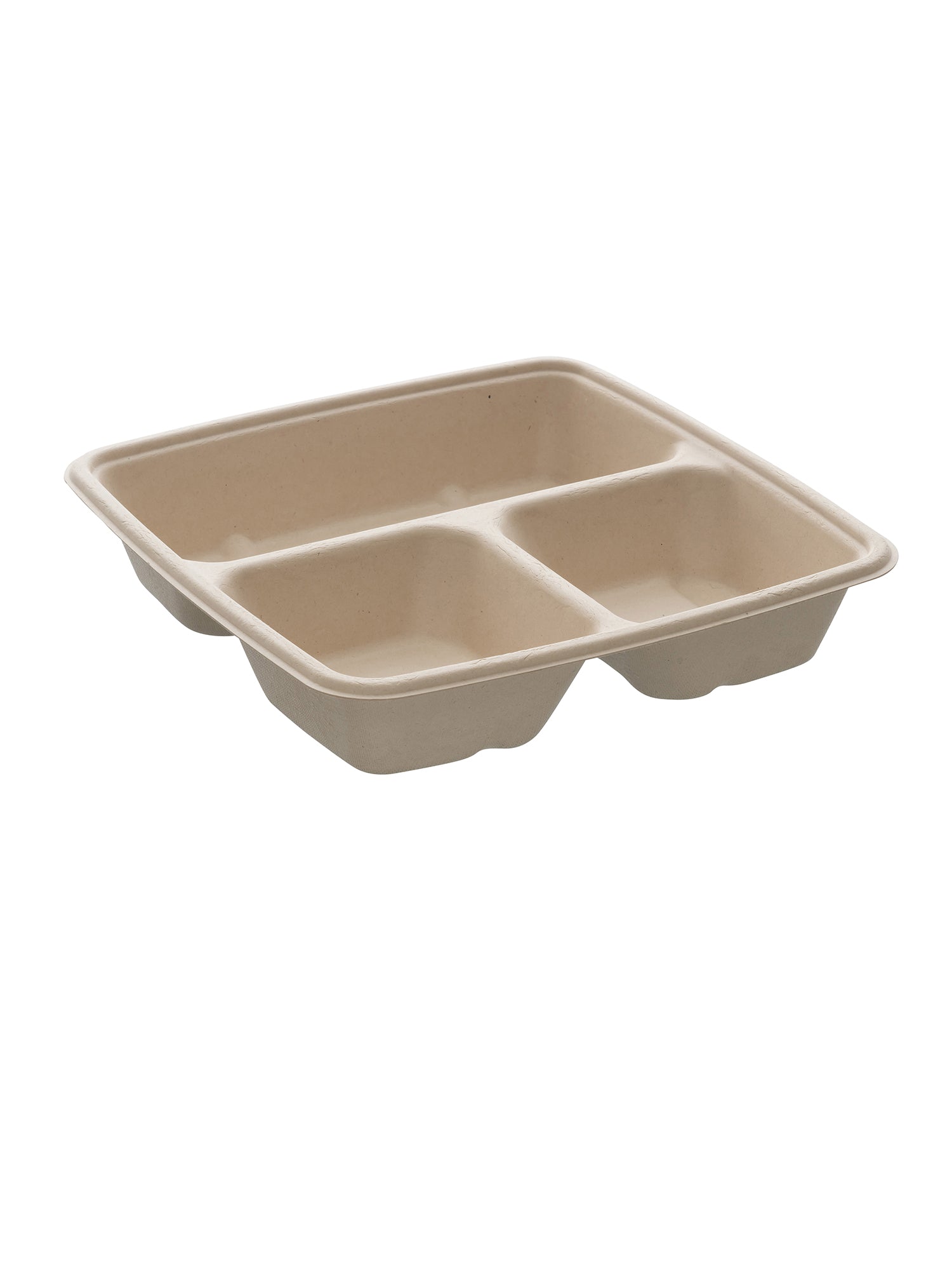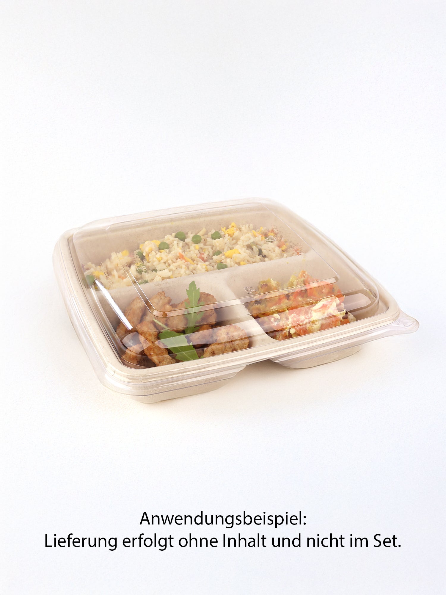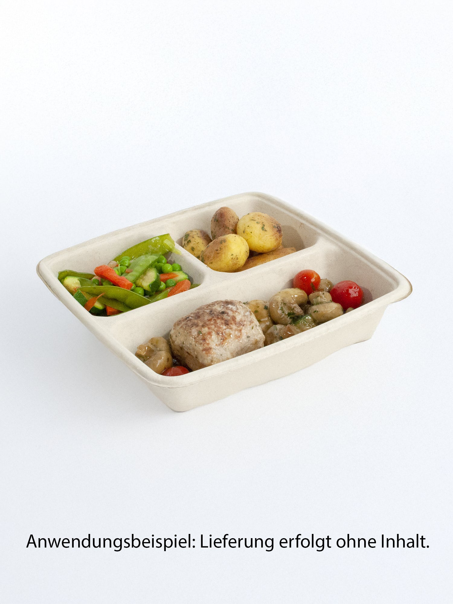 Menüschalen sind abgeteilt, damit beispielsweise auf dem Weg von der Theke zum Tisch die Bratensoße nicht in die Beilagen läuft etc. Diese Menüschale ist aus Bagasse, daher umweltfreundlich.